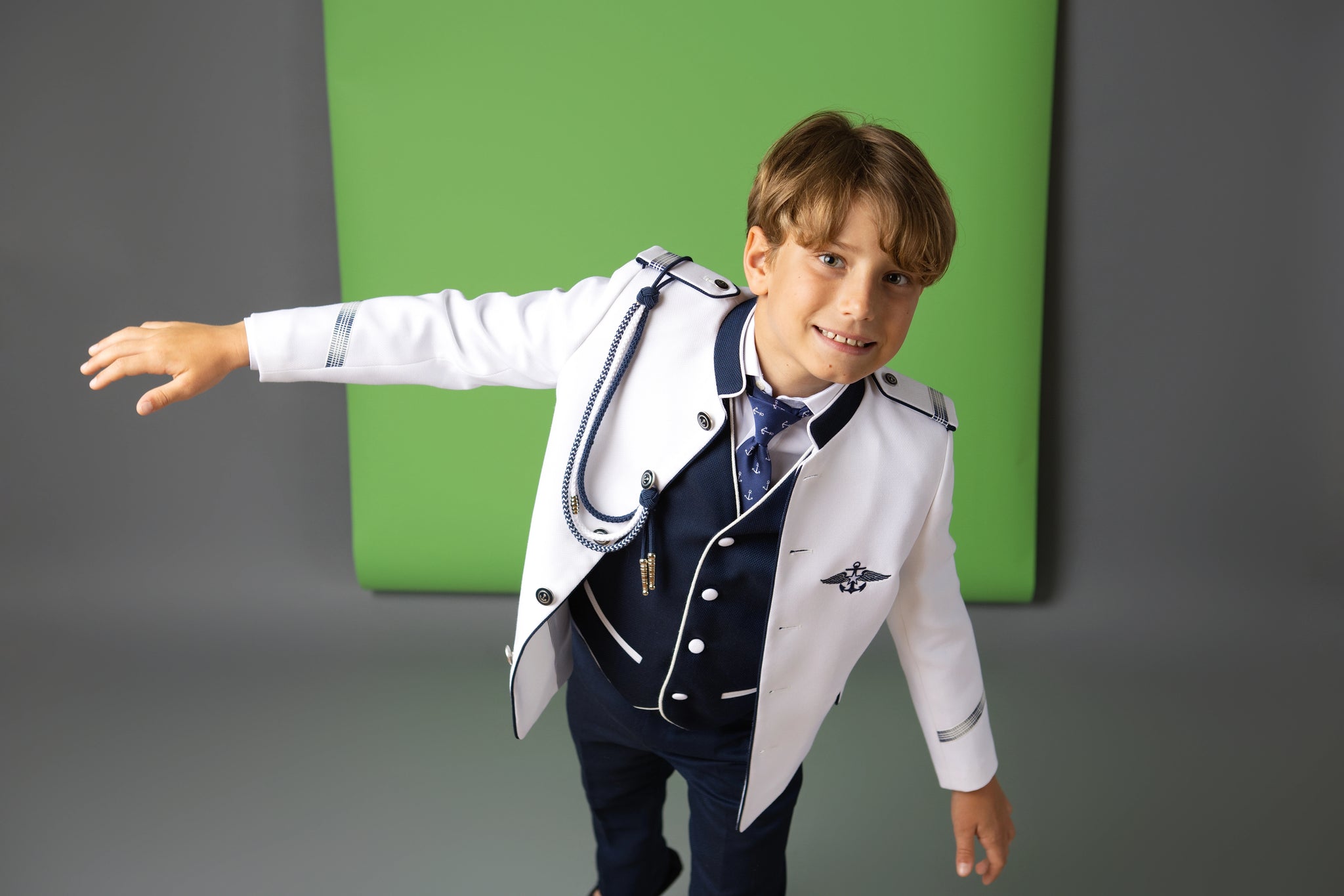 Traje almirante con chaqueta en blanco y adornos en azul marino. Chaleco y corbata en azul marino y camisa blanca. Pantalón en marino.