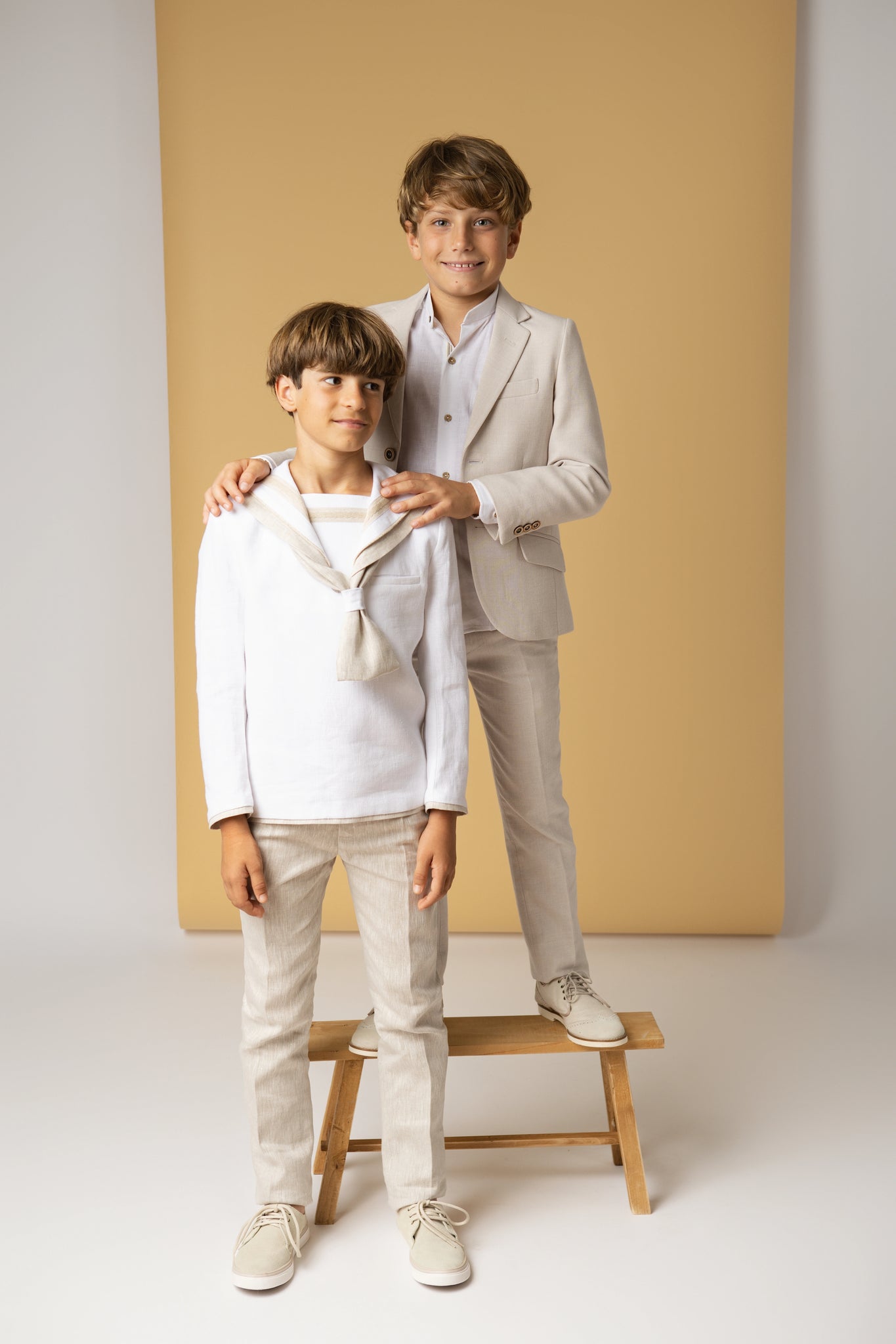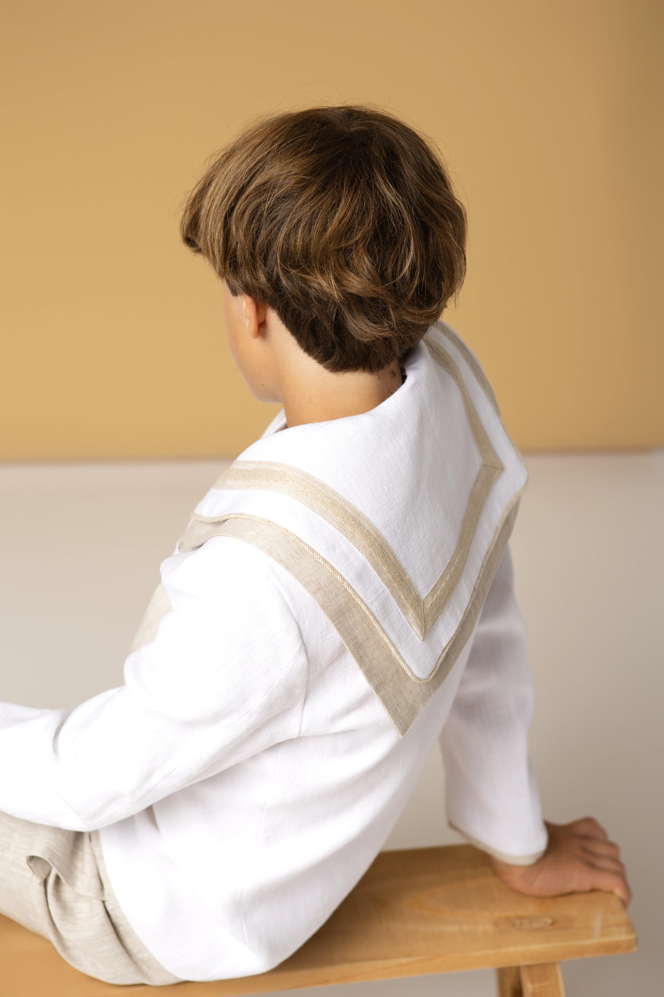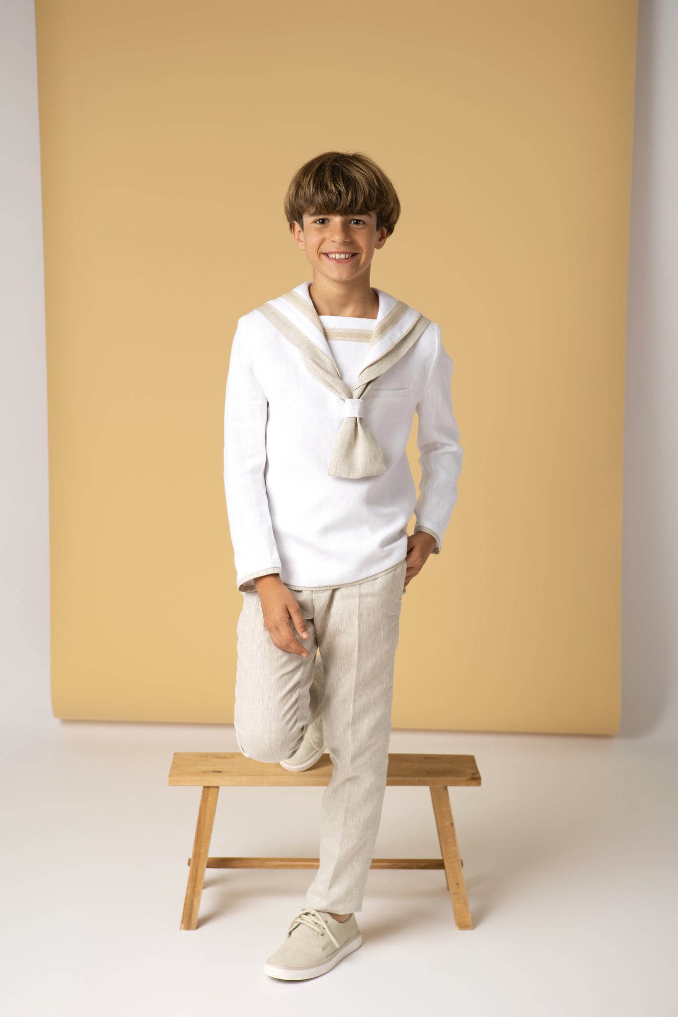 Traje marinero, casaca blanca, pantalón y cuello color tostado