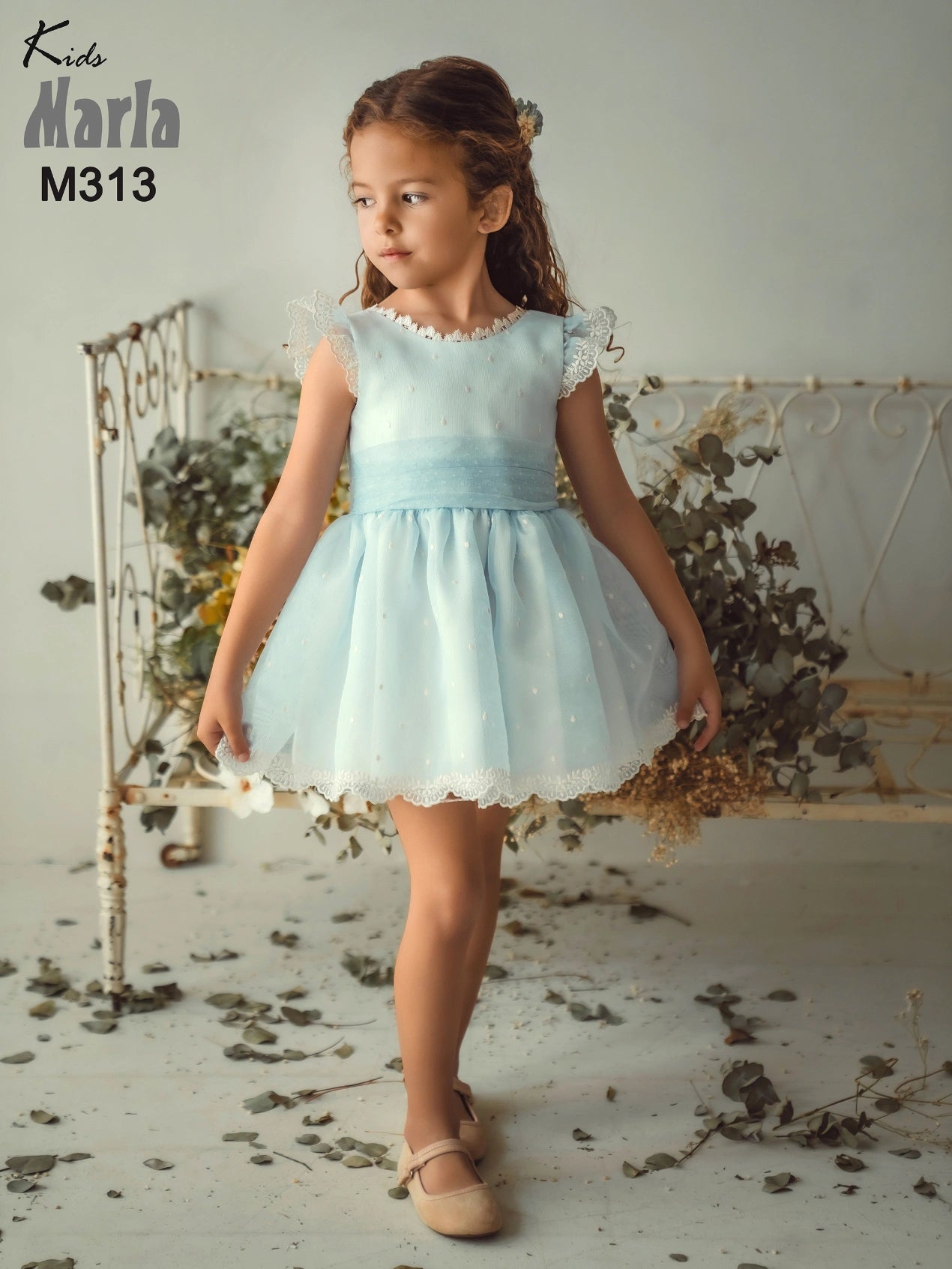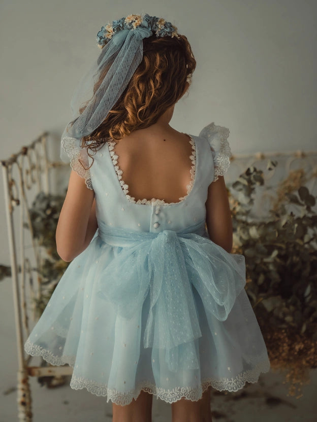 Vestido azul en tejido rústico con topos. Espalda en U con lazo.