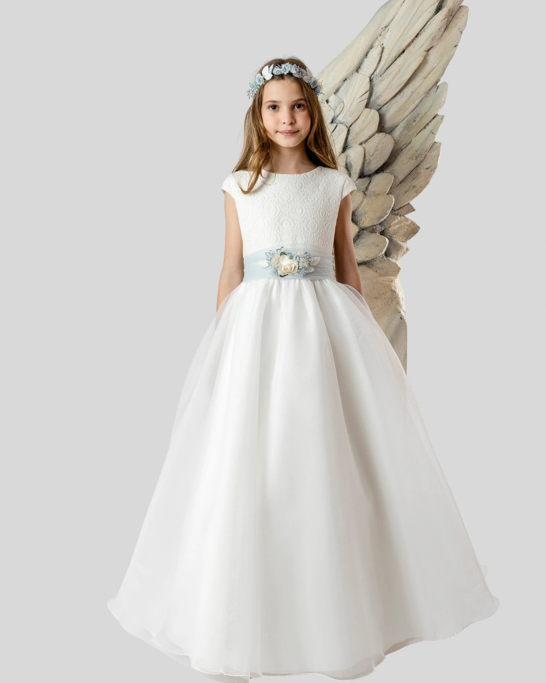Vestido manga corta de tul con fajín azul empolvado con aplique floral.