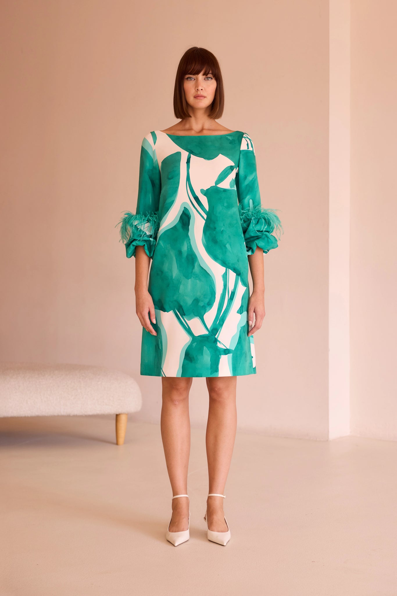 Vestido corto recto escote barco y mangas adornadas con plumas.