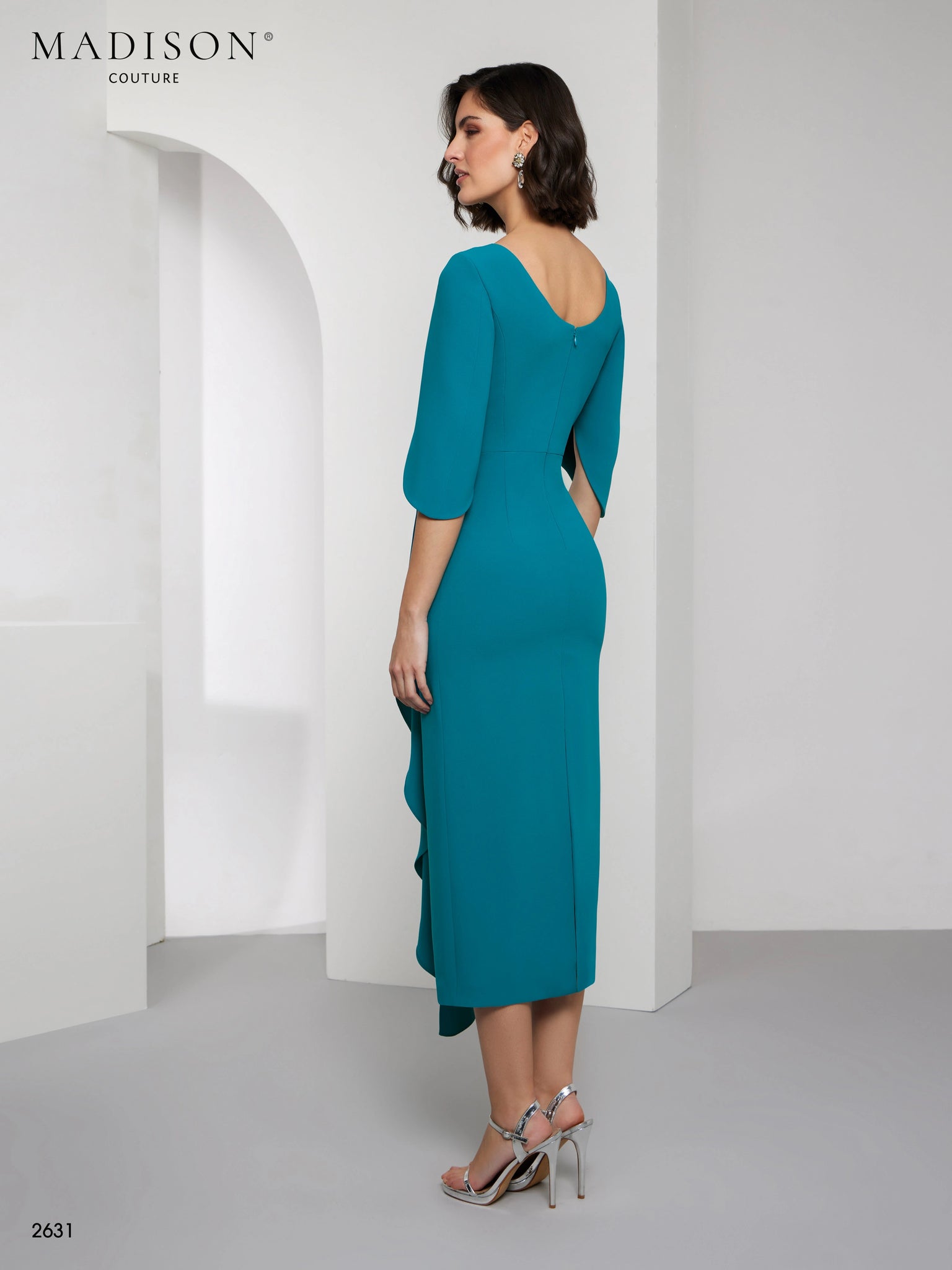 Vestido de fiesta manga pétalo, abertura en escote y volante en la falda. Aplique floral en cintura y hombro.