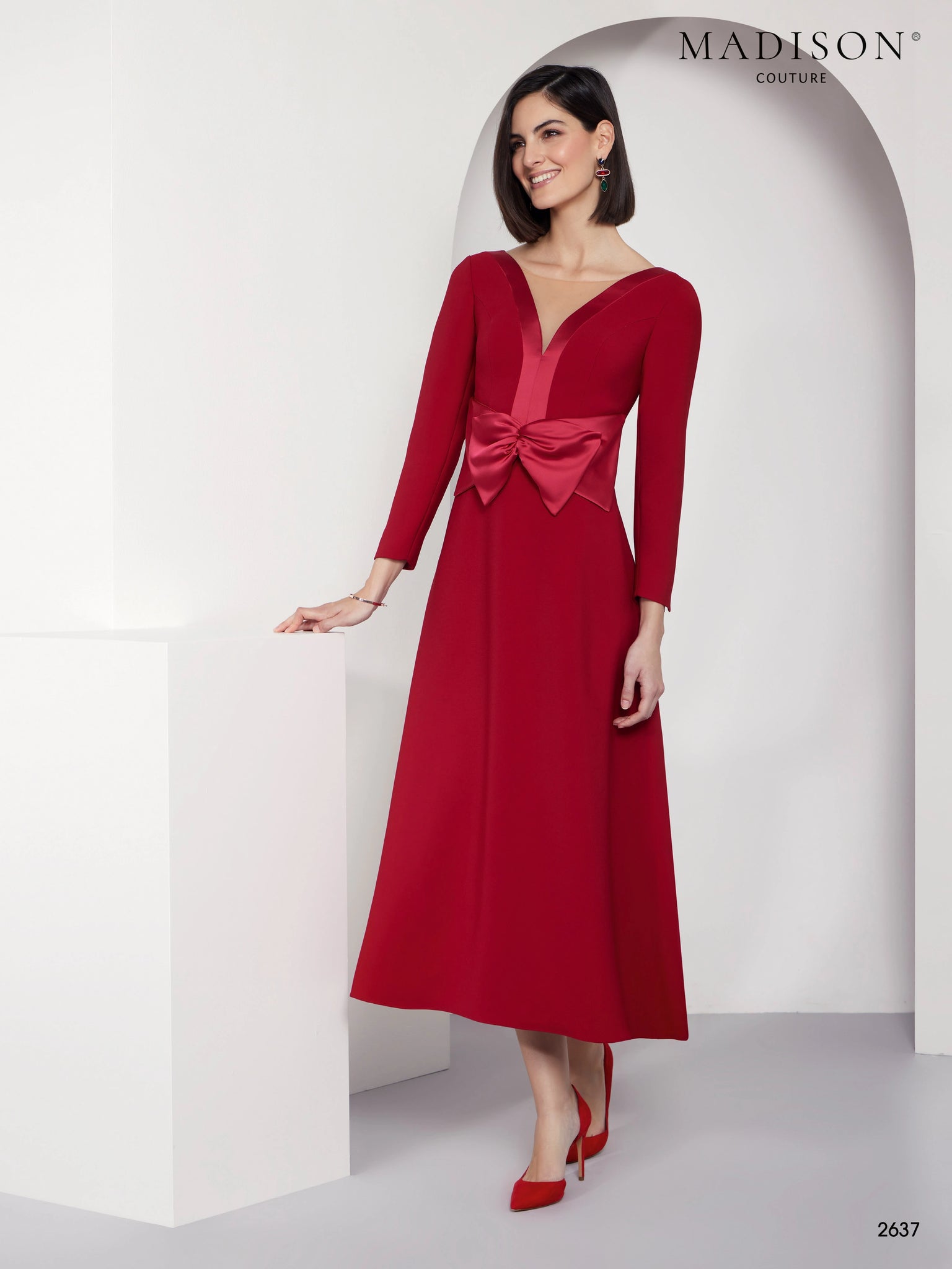 Vestido de fiesta manga francesa con lazo en la cintura, falda acampanada.