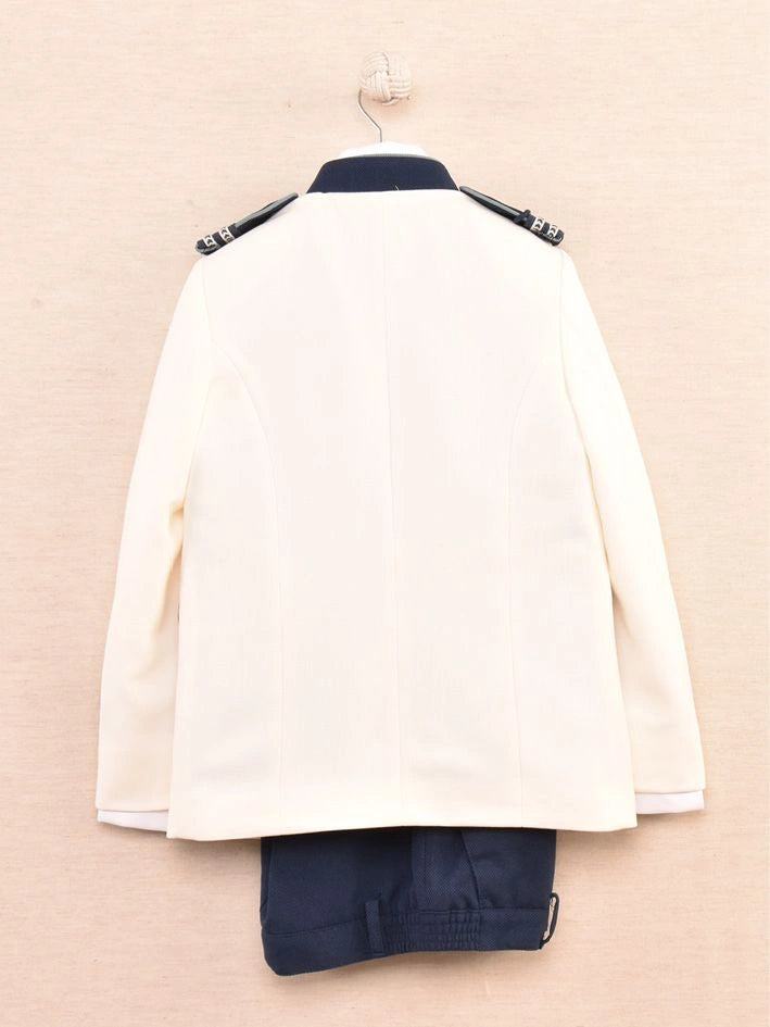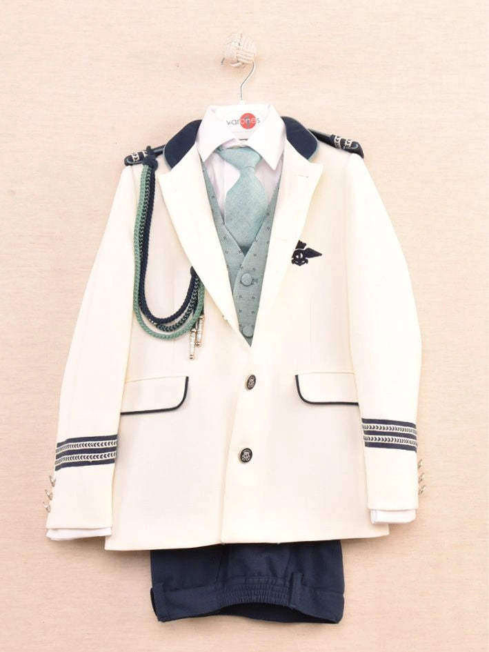 Traje de chaqueta almirante blanco, con adornos en azul marino, camisa blanca, chaleco y corbata en tonos verdes. Pantalón azul marino
