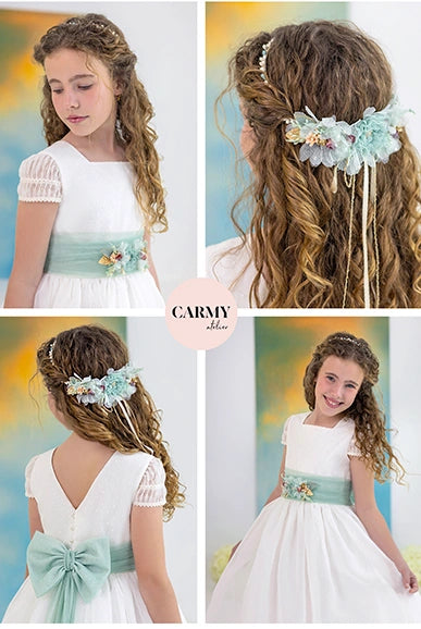 Vestido color natural y verde menta, modelo fantasía con organza rústica y tul bodoques. Talle normal.