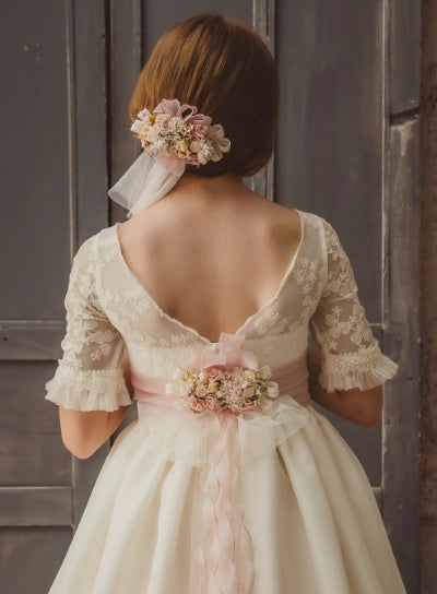Vestido fantasía beige tejido rústico, manga corta y fajín rosa empolvado. Espalda en V con motivo floral.