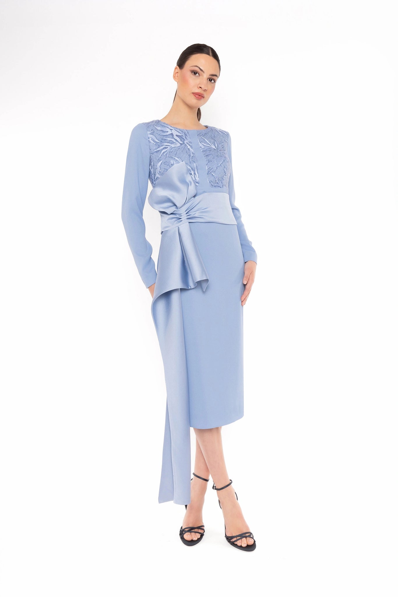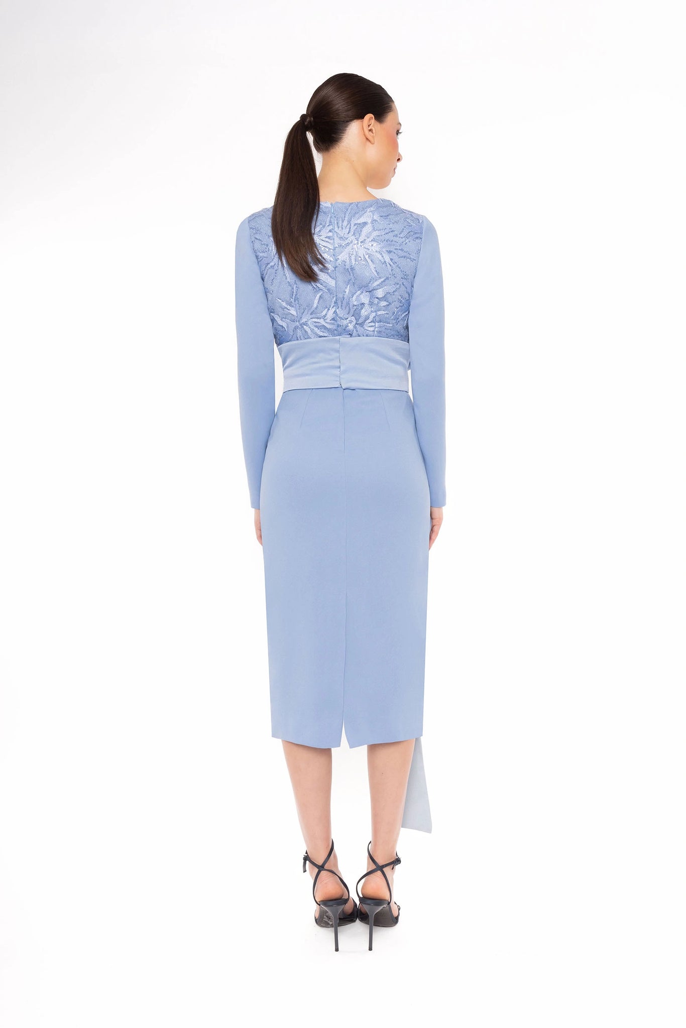 Vestido midi con manga larga y corte recto. Cuerpo con estampado floral y fajín con lazo en con caída lateral