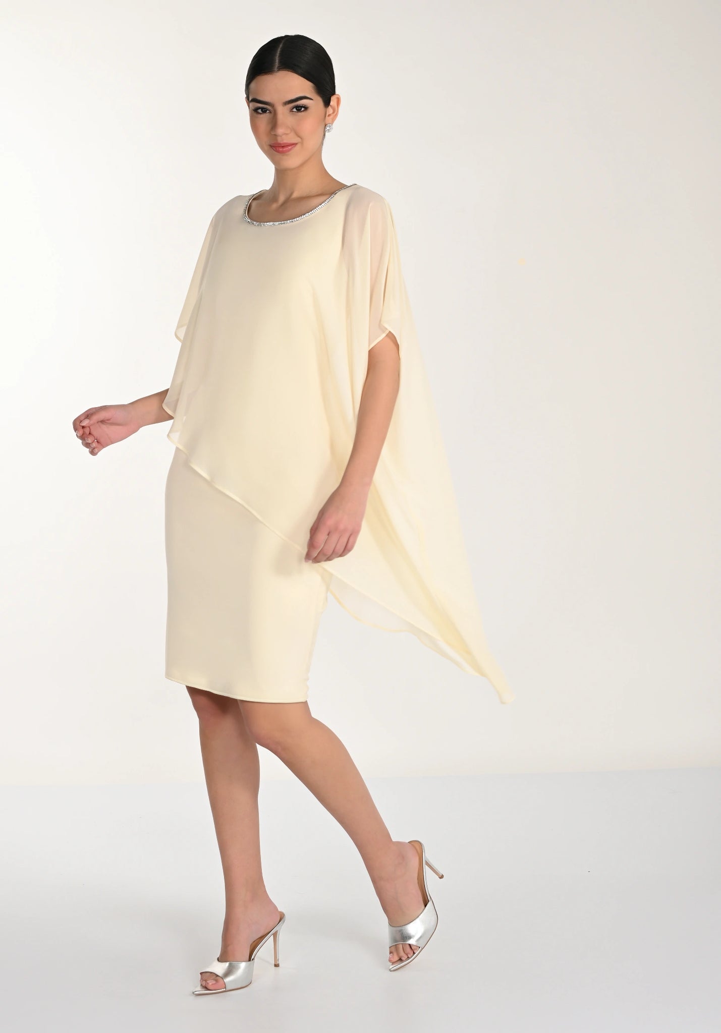 Este vestido midi de manga corta, confeccionado en tela de gasa, destaca por su diseño con capa superpuesta en el mismo tono, que estiliza la silueta y aporta movimiento.