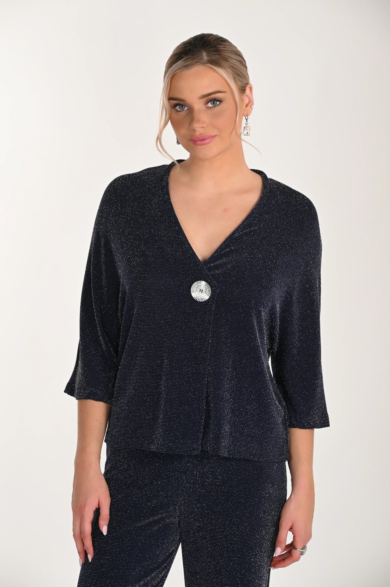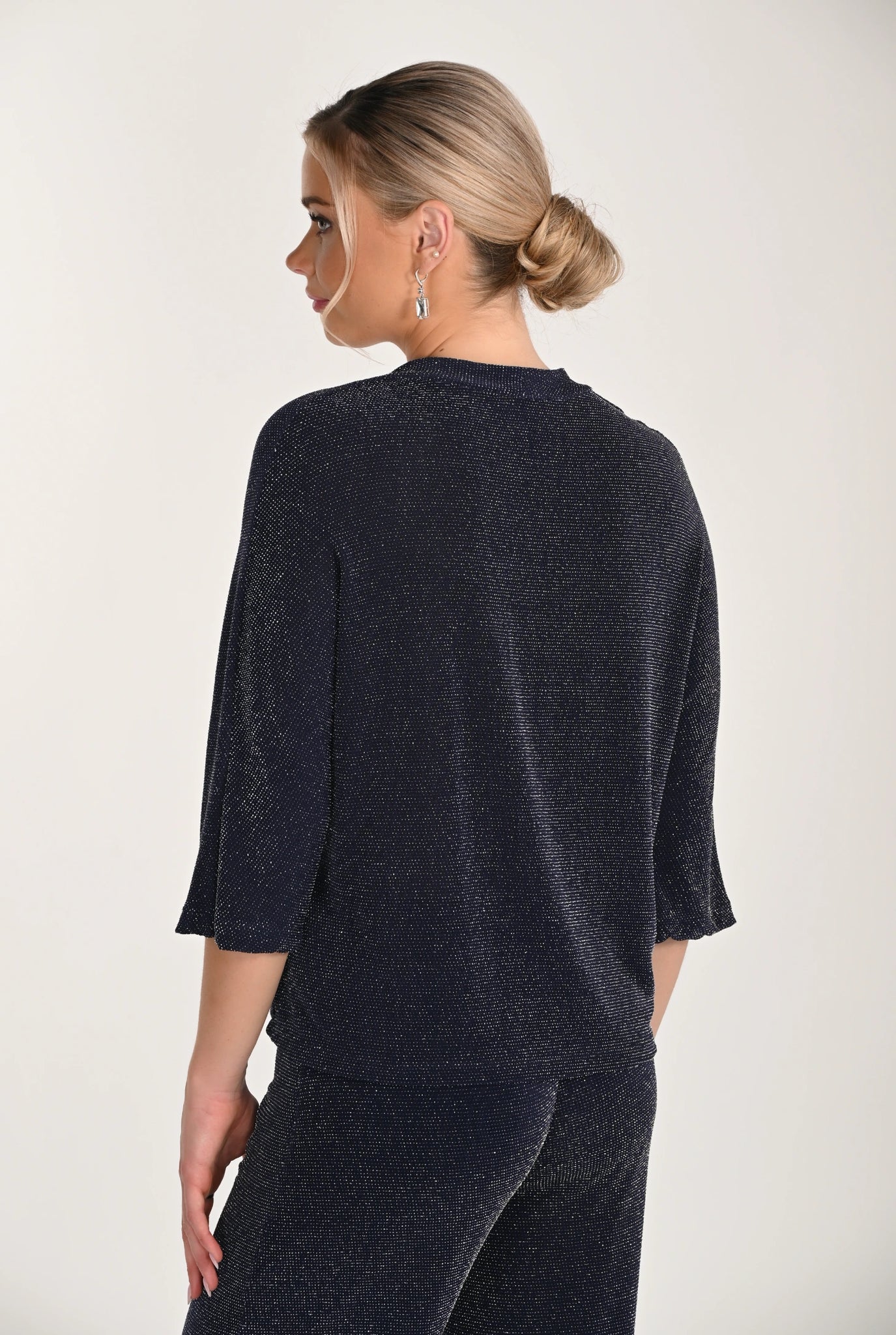 Conjunto de fiesta en tejido brillante con blusa de manga tres cuartos y escote en pico. Pantalón largo de corte recto.