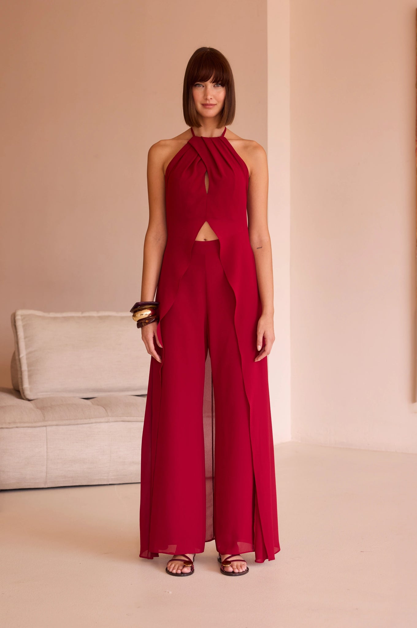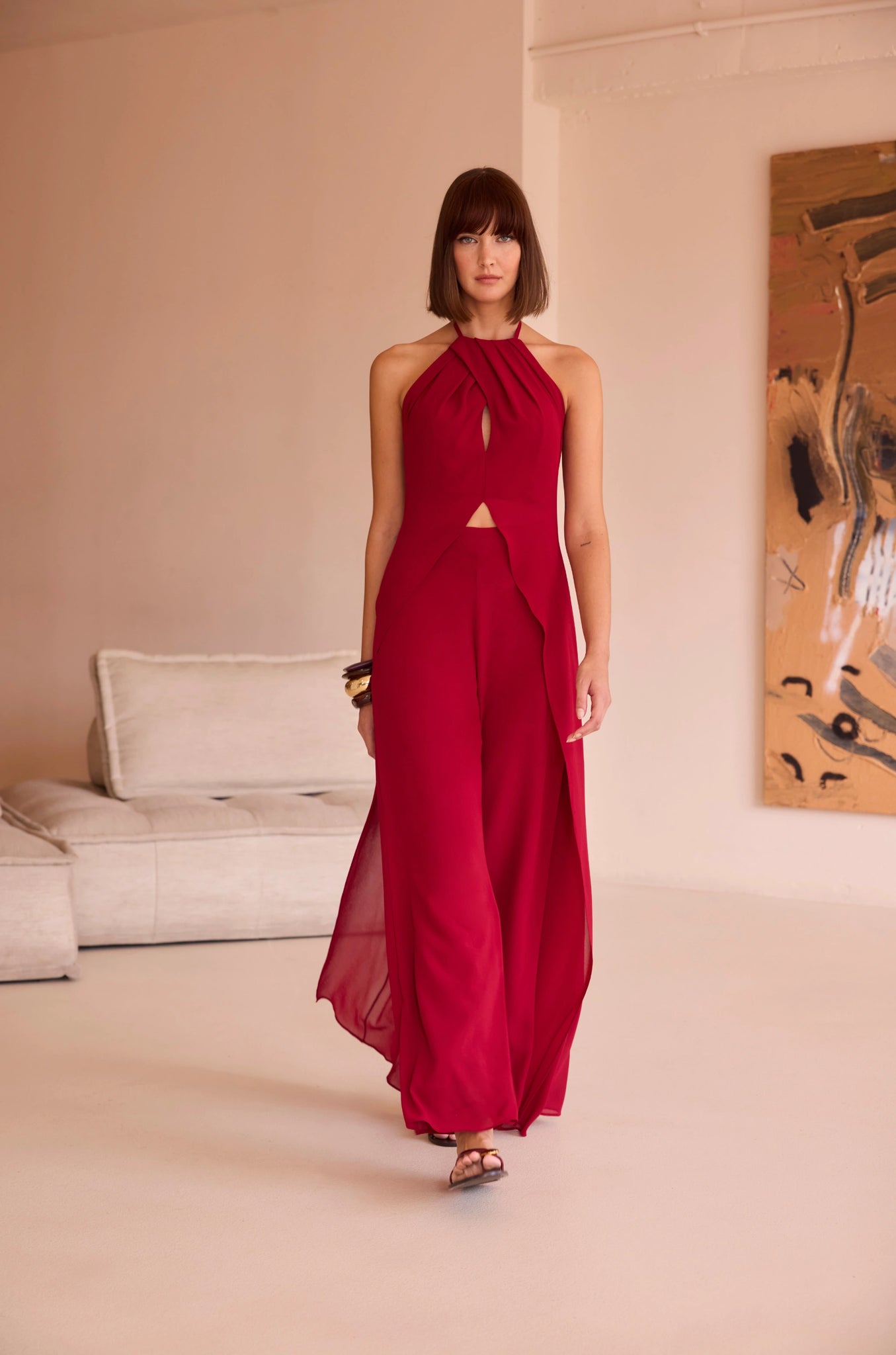 Mono con escote halter y drapeado cruzado en el cuerpo. Pantalón ancho y con gran caída.
